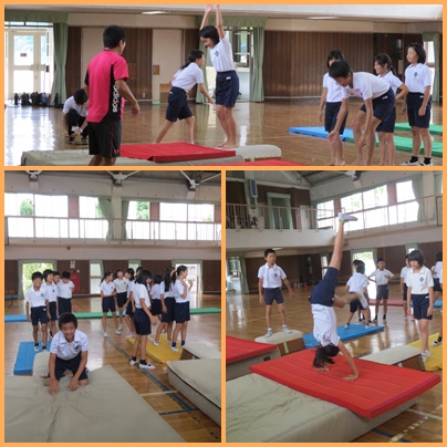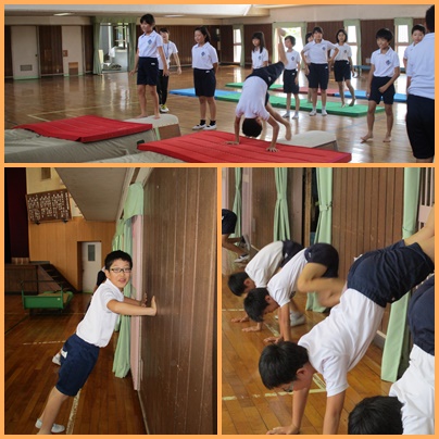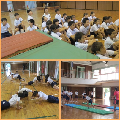 今日は、スポーツ指導員の福井晃先生に器械運動の指導をしていただきました。ウォーミングアップで腕の力をつける方法を教えていただきました。