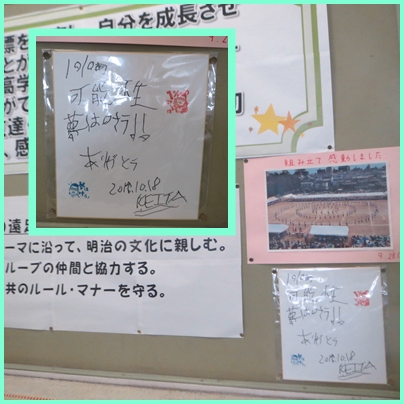加藤啓太さん!色紙ありがとうございました! 公開日 2019/10/23 更新日 2019/10/23 今日のできごと ○ 10月23日(水) 先日、ご講演頂いたロンドンパラリンピック「ボッチャ」の日本代表選手の加藤啓太さんから頂いた色紙が、各学年の掲示板に貼られました。 子どもたちは、毎日色紙を見て、夢に向かって頑張ろうとしています。ありがとうございました。 いいね(0)
