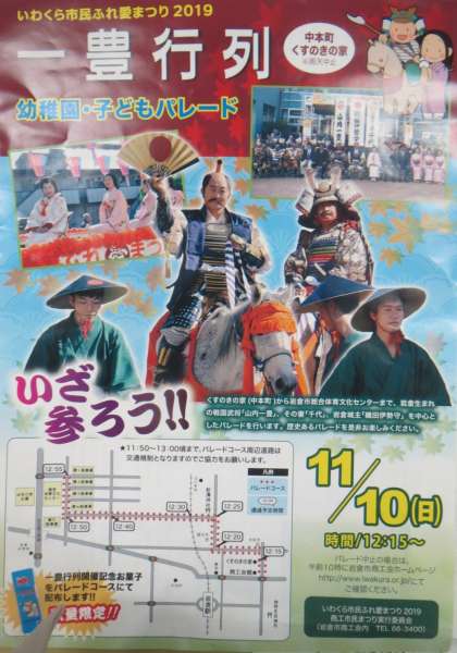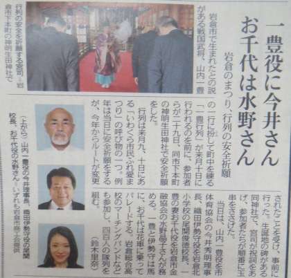今日の中日新聞や今月の岩倉の広報でもお知らせされていますが、11月10日(日)の「いわくら市民ふれ愛まつり」の呼び物の一つ「一豊行列」で、校長先生が織田伊勢守役を務めます。