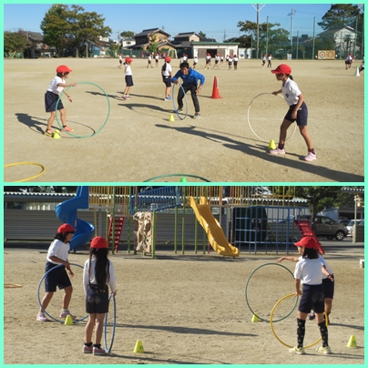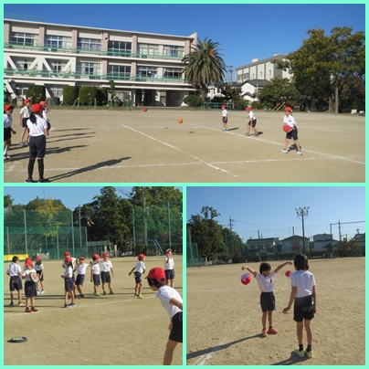 体つくり運動をしました。フリスビー、フラフープキャッチ、ボール投げ、瞬間キャッチなどゲームを通して楽しみながら、瞬発力を鍛えました。