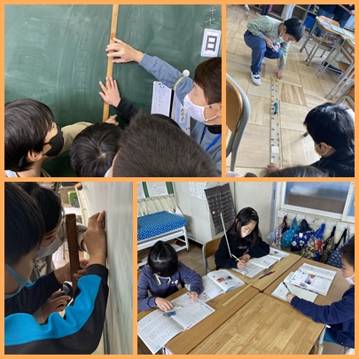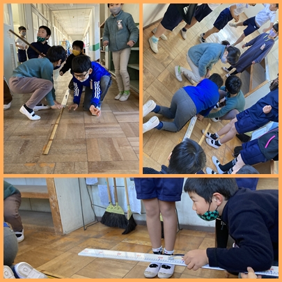 また、休み時間に、「廊下の長さがどうしても知りたい」と自主的に1mものさしで一生懸命に測る子どもたちもいました。廊下の長さは94m83cmだったそうです。