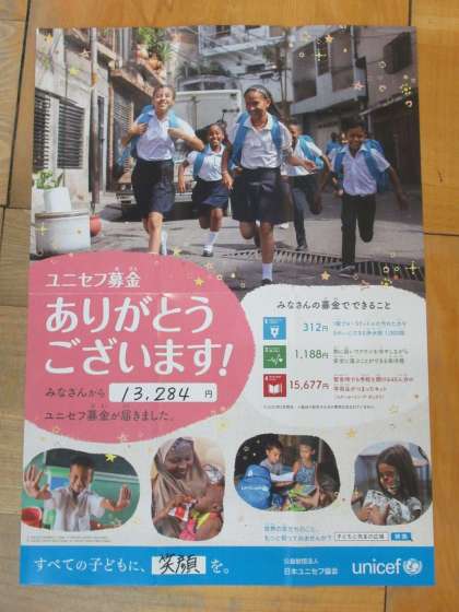 すべての子どもに、笑顔を。 公開日 2021/06/18 更新日 2021/06/18 今日のできごと ○ 6月18日(金) ユニセフから募金のお礼が届きました。 皆さんからの募金が、世界中の子どもたちの笑顔につながることを願っています。 いいね(0)
