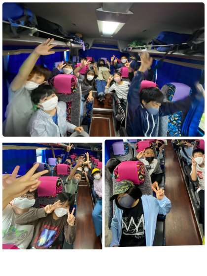 バスに乗り自然の家に向かっています。 天気は雨ですが気持ちは晴れ! みんなで頑張りましょう。