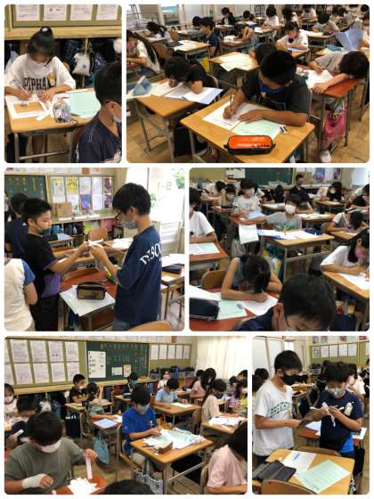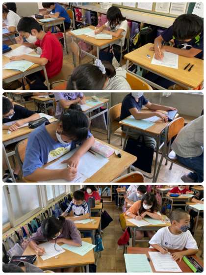 野外学習明けの本日でしたが、ほとんどの児童が登校できました。午後からは、野外学習の振り返りを行い、心に残ったことや協力できたことを振り返りシートに記入しました。また、野外学習で仲間の良いところをカードを書いて、互いに送り合う活動も行い、どのクラスも温かい雰囲気でした。