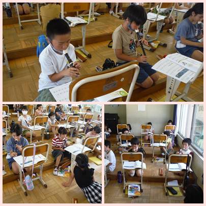 音楽室からリコーダーの音色がきこえてきました。優しくトゥ、トゥ、トゥと吹くと、きれいな音色になります。ペアでお互いの音色を確認していました。