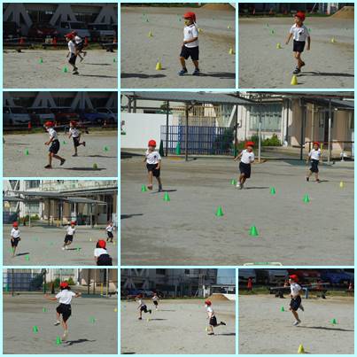 1年生の体育です。スキップ、ケンケン、片足で飛び越えなど。バランス感覚が大事です。日差しは暑いですが、すっきりした空気の中で、元気に走り回っていました。
