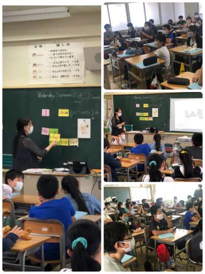 5年1組は、外国語で先生のジェスチャーが何の動きを表しているのかを考えたり、He can 〜に続く文を考え、全体で交流したりして楽しく活動していました。