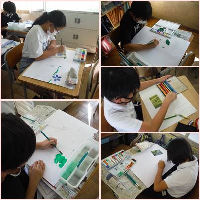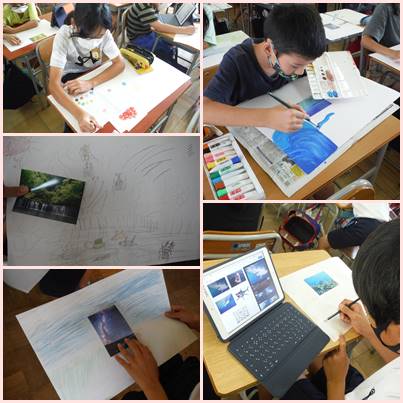 5年生の図工では、1枚の写真からイメージを膨らませて、写真と絵を融合させた作品を描いています。それぞれの発想力が生き生きとした絵に表されています。これからの展開が楽しみです。