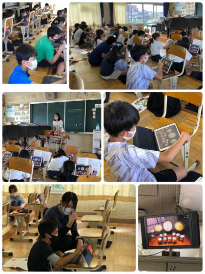 5年1組は音楽の学習で、タブレットのアプリを使って楽器を鳴らしていました。みんなで音をそろえたり、楽器ごとに分かれてタップしたりして楽しく学習していました。