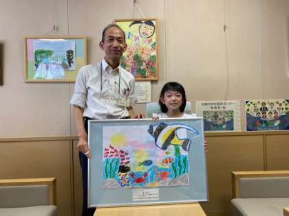 教育長室に飾られました 公開日 2021/10/04 更新日 2021/10/04 今日のできごと ○ 10月4日(月) 岩倉市役所の教育長室に本校児童の絵が飾られました。 国語科で『スイミー』を学んだ後、そのスイミーが見た海の世界を想像して描きました。背景の泡は、洗剤と絵の具を使って描いてあります。画用紙からはみ出るほど大きな魚を、スイミーがこっそり見ています。 いいね(0)