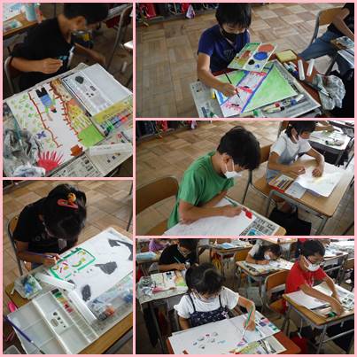 3組は図工で色塗りをしています。細かいところもはみださないように、丁寧に筆を動かしていました。