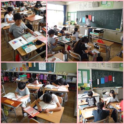 4組は国語で「ちいちゃんのかげおくり」の学習です。第2場面を読んで、どんな色のイメージか、そう考えた理由は何かをノートに記入していました。