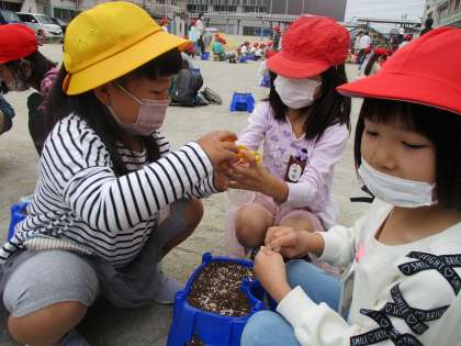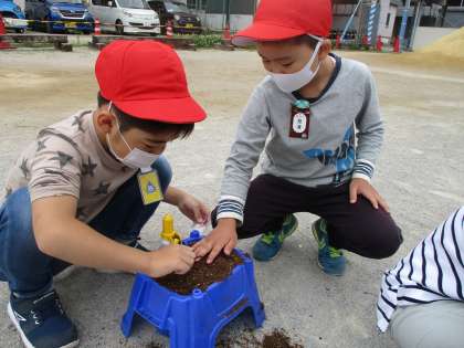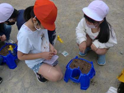 1年生のアサガオ植えのお手伝いをしました。種を置く場所や水の量を、1年生に優しく教える姿は、頼もしいお兄さん・お姉さんのようでした。