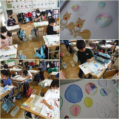 3年生 図工 公開日 2022/05/13 更新日 2022/05/13 3年生 ○ 5月13日(金) 物語の場面絵を使って、絵の具の練習です。 水を多めに使い、絵の具の色を混ぜながら、透明感のあるシャボン玉を描いていました。 いいね(0)