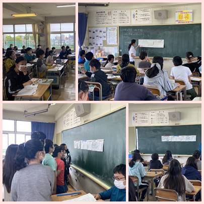 家庭科の授業では、ナップサック作りが始まりました。グループの仲間と協力して活動しています。完成まで頑張りましょう!