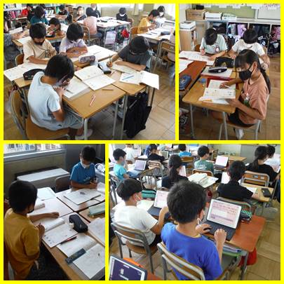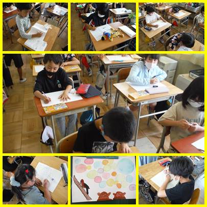 3・4年生 授業の様子 公開日 2022/05/23 更新日 2022/05/23 3年生 ○ 5月23日(月) 3年生は、難しい顔で算数の問題を解いたり、地図記号の学習をしたり、ふんわりとした色のシャボン玉を描いたりしていました。 4年生は、グループになって算数の課題を考えたり、社会科で自分の考えを書いたりしたいました。 給食を食べた後の5時間目ですが、どの学年も授業に真剣に取り組んでいました。 いいね(0)