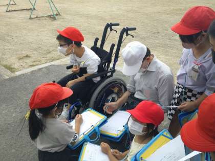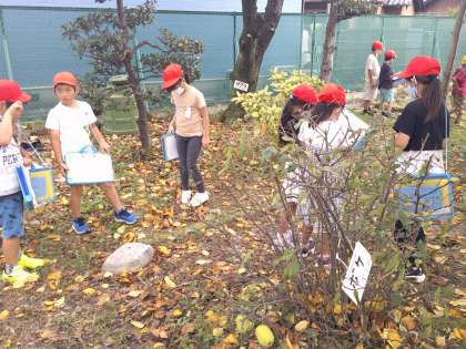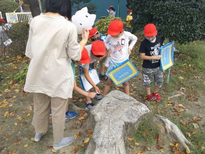 今日の音楽は、「音さがし」です。外へ出て、自然の中でいろいろな音を探しました。落ち葉のこすれる音や風で葉っぱが揺れ動く音など、静かにするといろいろな音が聞こえてきました。
