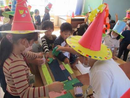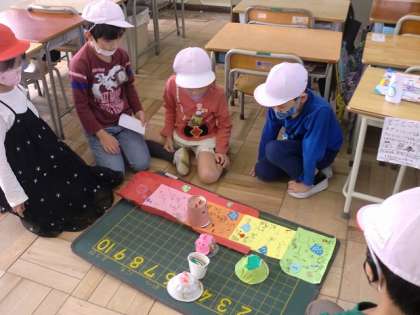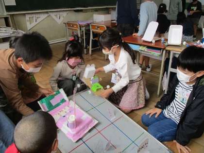 おもちゃ会をしました 公開日 2022/10/14 更新日 2022/10/14 2年生 生活科の学習で、紙コップや段ボールなどを使ったおもちゃ作りを行いました。おもちゃ会では、そのおもちゃを1年生に紹介し、遊んでもらいました。遊び方を説明する店員役、1年生をお店に連れて行く誘導役に分かれて、それぞれの役割をがんばりました。おもちゃ会が終わった後、2年生のみんなは、頼もしいお兄さん・お姉さんの顔になっていました。 いいね(0)