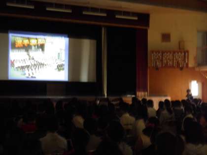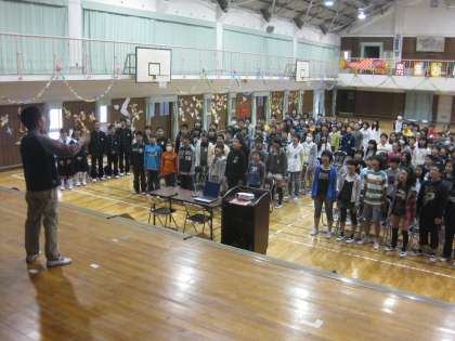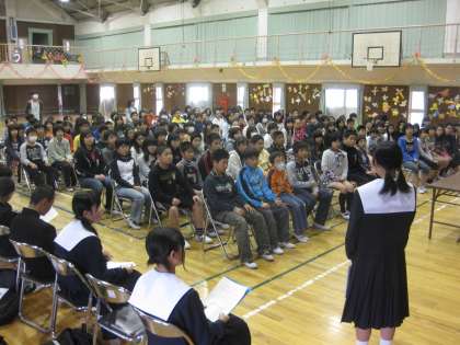 昨年度、本校を卒業した岩倉中学校の1年生が来校し、卒業を目前にした6年生のために中学校生活の説明をしてくれました。まず、映像で中学校の行事などを紹介してもらった後、○×クイズで確かめました。そして、勉強や学校生活、部活動などそれぞれについてメッセージを語ってくれました。6年生は「旅立ちの日に」を合唱して、お礼の気持ちを表しました。中学校生活に期待や不安の入り交じっている6年生にとって、中学生から直接話が聞けたことで、不安が小さくなり、期待がぐっと大きくなったことと思います。