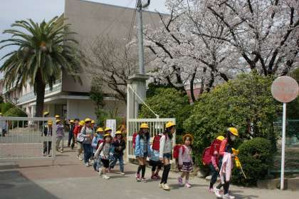 本校では一斉下校を「サンサン下校」と呼んでいます。今日は1年生といっしょに下校する初めてのサンサン下校です。前で並んで待っている1年生を班長さん、副班長さんが迎えにきて、並ぶ位置を確認しました。その後、通学班の担当の先生と通学路点検をしながら下校しました。