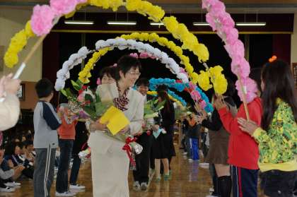 今日は、このたびの定期異動で転勤・退職された先生方とのお別れの式、離任式がありました。10名の先生から、北小の子どもたちに最後のお話をしていただきました。その後、お礼のメッセージと花束を贈り、いっしょに校歌を歌ってお別れしました。