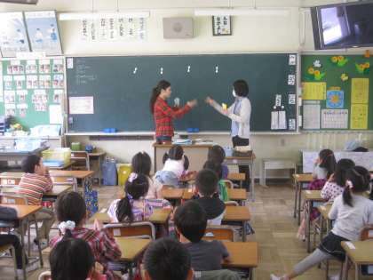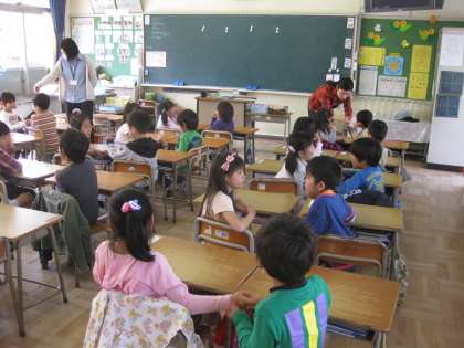 1年生でも外国語(英語)活動の授業がありました。英語で「ハロー」とあいさつした後,「マイ ネーム イズ〜」と自己紹介をしあいました。さらに英語でじゃんけんをして英語に親しむことができました。