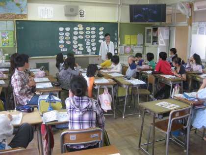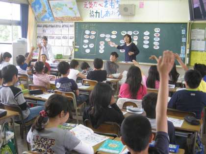 24日(火)には1組と2組,今日は3組と4組に給食センターから栄養士の先生に来ていただき,「食指導」をしてもらいました。来週の野外学習の2日目の朝食はバイキングということで,栄養のバランスのとれたメニューを選ぶには,どんなことに気をつけたらいいのかを教えてもらいました。ふだんの食事でも主食,主菜,副菜のバランスを考えて食べるようにするといいですね。