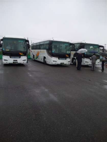 あいにくの雨になりましたが、子どもたちは元気いっぱいです。3台のバスに分乗して出発しました。