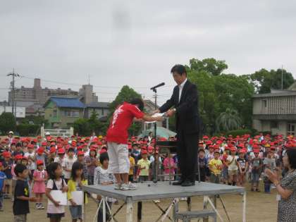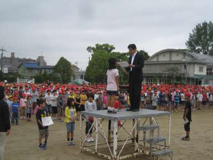 朝礼で「よい歯の子」の表彰がありました。先日の歯の検査で「よい歯の子」に選ばれた各学年1名ずつの児童が表彰状をもらいました。歯磨きをしっかりして、丈夫な歯を作りましょう。