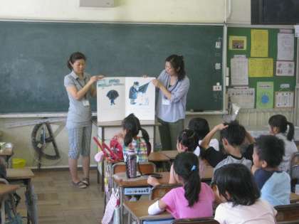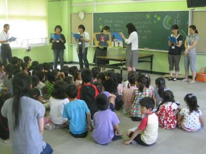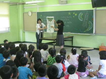 「ミニおはなし会」は2時間目の放課にふれあいホールで行われました。1つ目のお話は東町に伝わる岩倉の昔話「ねじり半てん」【写真2枚目】,2つ目は「おばけのてんぷら」,最後は「ぴょーん」でした。【写真3枚目】