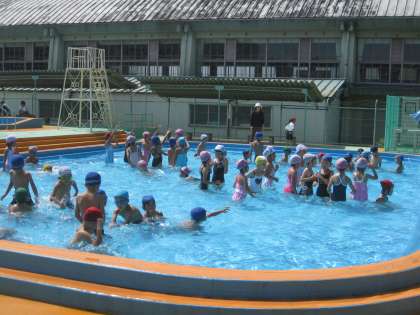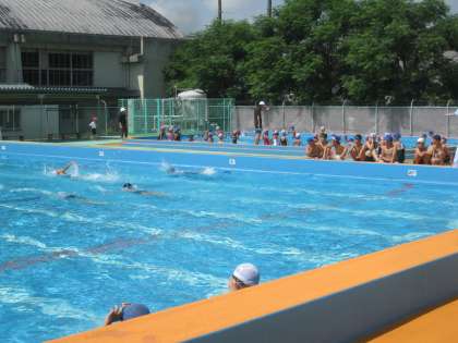 東海地方は17日に「梅雨明け」しましたが,今日も朝から気温がぐんぐん上昇しました。こんな日は………,プールがいちばんです。2時間目には小プールでは1年生,大プールでは5年生が水しぶきを上げていました。5年生は,泳力検定で25m,50mなど自分の目標に向けてチャレンジしていました。
