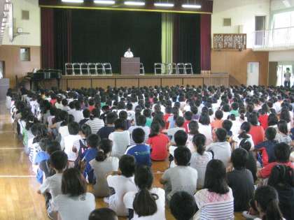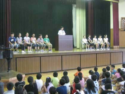 今日は1学期の終業式です。1学期がんばってきた一番いい姿を見せようと,どの学級も静かに体育館に入場することができました。式では,校長先生の話の中で,夏休み中に学校を代表して,平和記念派遣団で長崎に行ったり,消防学校や青少年赤十字トレーニングセンターでの研修に参加したりする11名の児童のみなさんの紹介がありました。