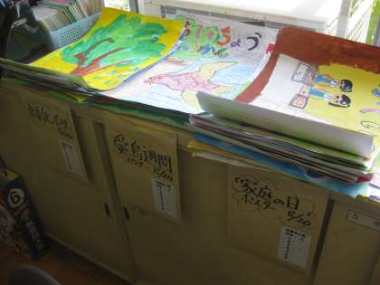 夏休み2回目の出校日です。今日は,ポスターや作文など応募作品の提出日になっています。教室でみんなが出した作品を,職員室に持ってきて整理し,発送する準備をしています。