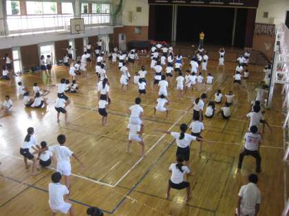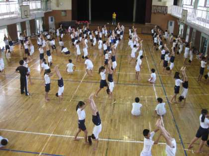 運動会に向けて6年生は夏休み前から組立体操の練習に取り組んでいます。今日は2学期初めての学校での練習です。夏休み中に,家で練習を続けてきた子はバッチリとできたと思いますが……。