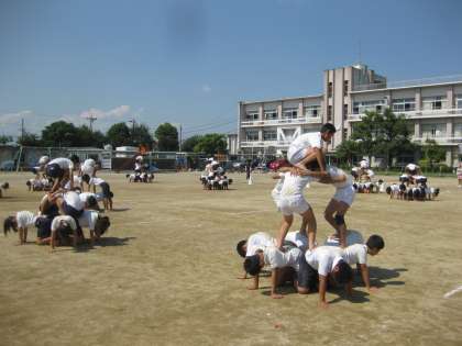 4時間目には,これまでは体育館で練習していた6年生が運動場デビューしました。みんなの心を一つにして立体ピラミッドを完成させます。(写真は「タワー」です。立体ピラミッドは当日の演技をお楽しみに!)