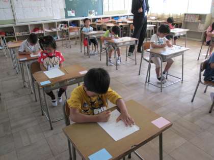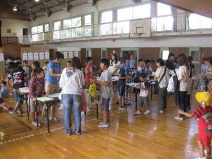 平成25年度に入学する予定の子どもたちを対象に「就学時健康診断」が行われました。1時ごろから家の人と一緒に,来年の1年生が次々と体育館に集まりました。保護者の方は体育館に残り,子どもたちは,班ごとに検査会場へ向かいます。お母さんとの別れがつらくて泣き顔の子もいましたが,がんばって内科・歯科の校医さんに診ていただいたり,視力,聴力などの検査を受けたりしました。