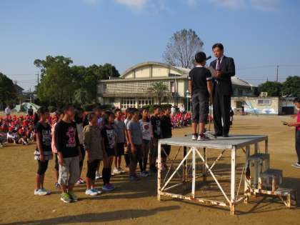 朝礼で,後期学級委員,代表委員,委員長の認証式と,10日に行われた陸上運動記録会の表彰がありました。