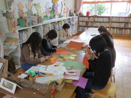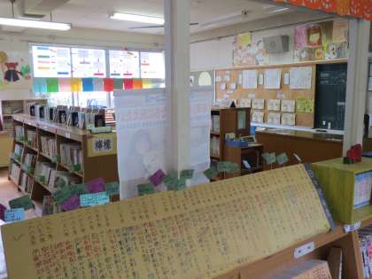 図書ボランティア掲示グループ「オープンセサミ」の皆さんのおかげで,高学年図書館が歴史の雰囲気を感じられる装いになりました。今日も,次の掲示物作りの作業をしていただいています。