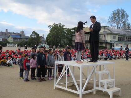 振替休日や、参観日の代休などで月曜日が休みの週が続いたので、久しぶりの朝礼です。夏休みに応募した作品募集の入選作品のお知らせがあちこちから届いています。今日は「MOA美術館児童作品展」と「尾張教育研究会書写作品コンクール」で入選した子を紹介し、校長先生から賞状を渡しました。