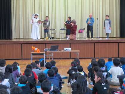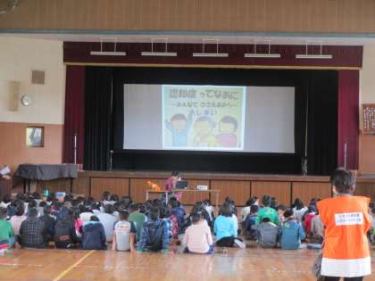 5年生が福祉についての学習の一環として、認知症ケアアドバイザーの皆さんを講師にお迎えして「認知症サポーター養成講座」を体育館で行いました。「認知症ってなあに」という電子紙芝居の後、「そうだね、おばあちゃん」の劇を見せてもらいました。認知症の方に接するときの合言葉は「そうだね、……」だということが分かりました。