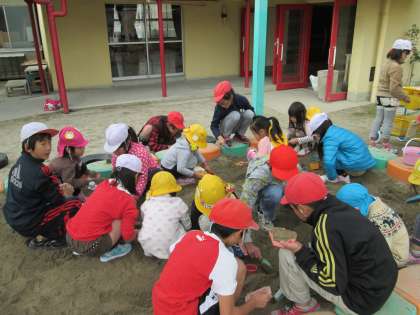 11月12日(火)と14日(木)に中部保育園を訪問しました。最初はお互いに少し遠慮がちであった子どもたちも、すぐに打ち解けて活動にはいることができました。ぬり絵をする子、ままごとをする子(ままごとセットは、4年生の子どもたちの手作りです)紙芝居を読んであげる子、砂遊びに興じる子など、園の内と外で目いっぱい交流する子どもたちの姿が見られました。