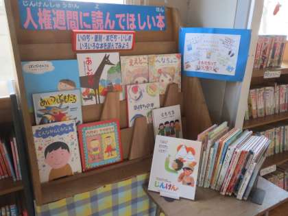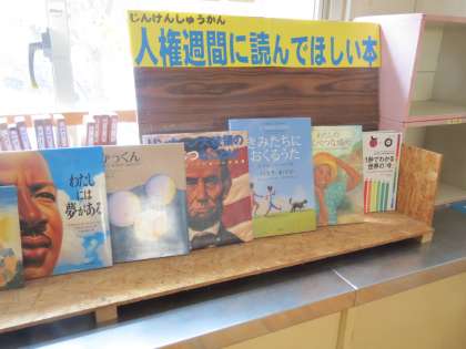 また、図書館には写真の「人権コーナー」が設置され、人権に関する本が紹介されています。ぜひこの機会に読んでみるとよいと思います。