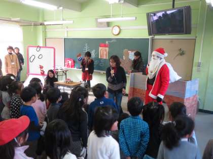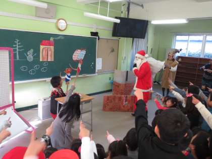 図書ボランティア「スマイル」の皆さんに、2時間目の放課にふれあいホールで「クリスマスミニおはなし会」をしていただきました。今日のお話は「ぐりとぐらのおきゃくさま」。途中で、ケーキを持った白いひげのおじいさんが登場しました。子どもたちからは、「あっ校長先生だー!」という声が上がりましたが…………、いえいえそうではありません。白いひげのおじいさんは、赤い服や帽子をかぶり、トナカイの引くそりに乗っていってしまいました。そう、おじいさんは、クリスマスイブによい子のみんなの所へプレゼントを届けるサンタクロースでした。