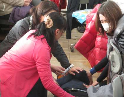 終業式の午後、食物アレルギーの対応についての研修会を行いました。教職員は原則として医療用医薬品を使用することはできませんが、例外として、アナフェラキシー発症時のエピペンの使用は認められています。エピペンを正しく使用できるよう映像を見て学習した後、ロールプレイングをして実習しました。