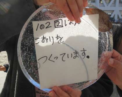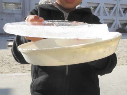 皿に水を入れて校舎のかげなどに一晩置いておいたら、今朝は、みごとな氷になっていました。1年生の顔より大きな氷です。1年生の手のひらより分厚い氷です。葉っぱもいっしょに凍っていました。