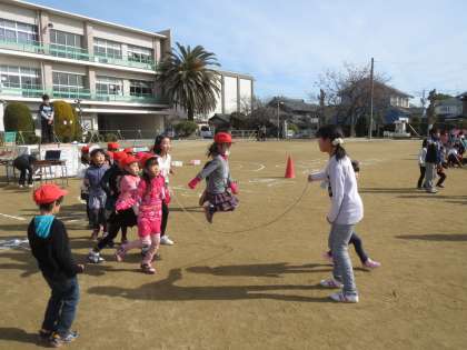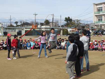 運動委員会が中心となって、「大縄大会」を行いました。1・6年、2・4年、3・5年のペア学級で行います。低学年の縄を回すのは高学年の児童です。ペア学級のみんなが跳ぶ回数を一生懸命数えたり、応援の声をかけたりというほほえましい場面があちこちで見られました。結果が出るまでの間には、ニュースポーツクラブの皆さんがダブルダッチなどのいろいろな跳び方を披露しました。