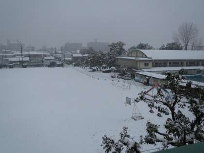 朝から降り続いた雪で、昼頃には運動場は真っ白になりました。中庭では雪だるまを作った子もいました。下校後に雪遊びをすることを楽しみにしていた子もたくさんいたと思いますが、2時過ぎには雨に変わってしまいました。