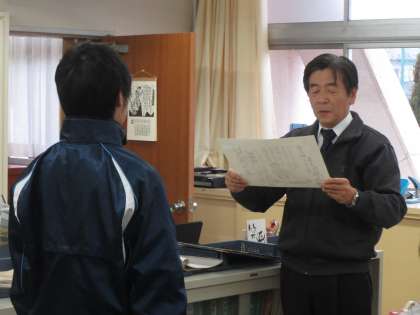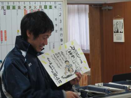 先日、1年生に「ビュンビュンごま」の授業に来てくださったビュンビュンごまの達人から「びゅんびゅんごま天才にんていしょう」が届きました。授業の中で、1年3組の先生が、両手両足を使って4つのビュンビュンごまを同時に回すことができたので、達人から「天才」に認定されたのです。校長先生から紹介され、認定証を受け取りました。