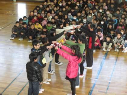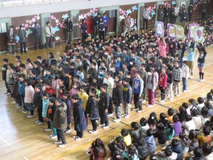 6年生を送る会 その1 公開日 2014/03/09 更新日 2014/03/09 学校行事 3月7日(金) 6年生を送る会を行いました。開会のことばに続き、6年生から5年生にさまざまな活動が引き継がれました。引き継ぎの後は、下級生による出し物です。 1年生はペア活動でお世話になったことを中心に、ことばと歌でお礼の気持ちを表しました。2年生は通学班でお世話になったことを中心にお礼の気持ちを伝えました。 いいね(0)