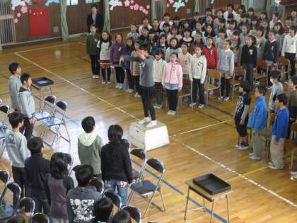 本日、1・2時間目に卒業式予行を、3時間目に6年生の修了式を行いました。